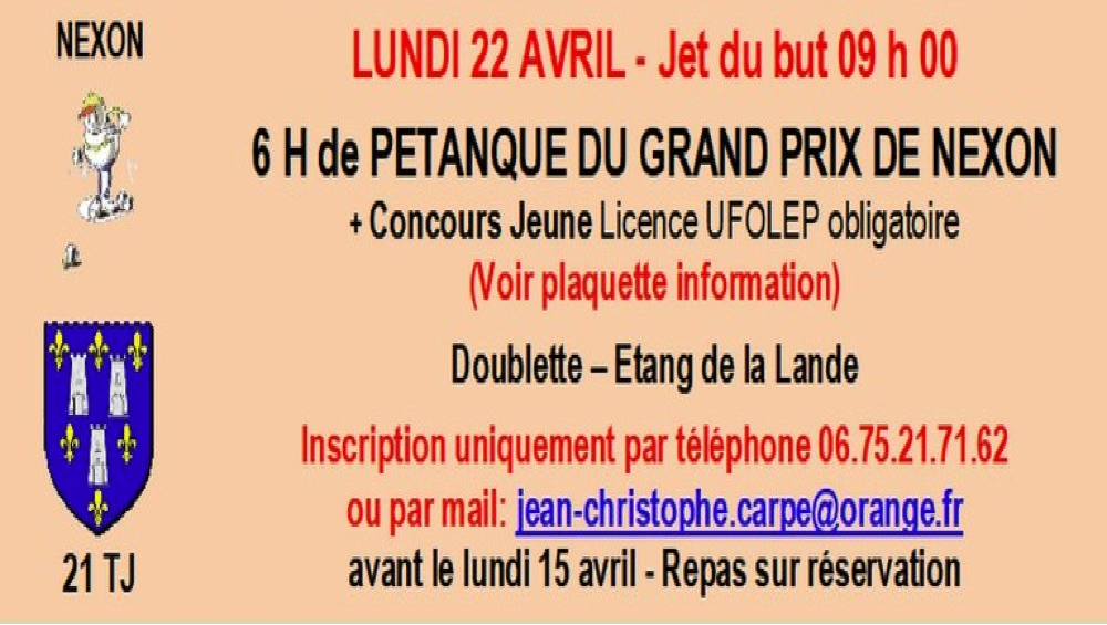 ci-joint le dossier INSCRIPTION ET RESERVATION REPAS des 6 H 00 DU GRAND PRIX DE LA VILLE DE NEXON qui se dérouleront le lundi 22 avril 2019.
