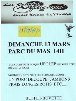 Le premier concours de la boule aredienne s'est tres bien passé, le temps a été plutot clement malgré les predictions; 49 équipes se sont disputées les très beaux lots mis en jeu.Tous les clubs de la haute vienne été presents sauf deux. A noter la bonne prestation de MATHIEU CLEDAT associé à PATRICE GRUMET qui a partagé en finale contre la doublette BODINO TARRAIN. MIREILLE VALAGEAS et CORIINE CHADOIN se sont inclinées en 1/2 finale du complémentaire. ALBERT FEREIRA accede également au 1/2 finale du principal.