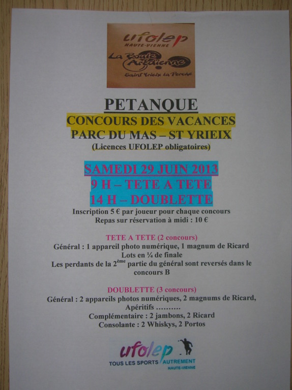 Samedi 29 juin aura lieu au PARC DU MAS le traditionnel concours des vacances UFOLEP de la boule aredienne .