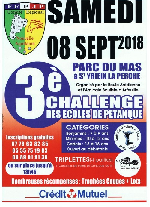 SAMEDI à 13H45 aura lieu le 3eme challenge des écoles de PETANQUE organisé par le club d'ARFEUILLE et la BOULE AREDIENNE. Ce challenge est ouvert à 3 catégories jeunes ainsi qu'aux débutants. NOMBREUX LOTS (COUPES , TROPHEES, BONS REPAS MAC DO, BONBONS etc..)
