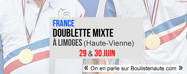 A partir du samedi 29 et jusqu'au 30 juin aura lieu à Limoges au Boulodrome du Moulin Pinard le CHAMPIONNAT DE FRANCE FFPJP Sénior Doublette Mixte. L'occasion d'aller supporter les équipes de la Haute-Vienne qualifiées, celles de la région également, mais aussi d'approcher et de voir les stars de la Pétanque Nationale. Avec le lien ci-après, vous retrouverez tous les noms des équipes et leur terrain pour les phases de poule : http://www.championnats-ffpjp.com/RsltCDF/2019/DMS/FFPJP_CDF_DMS_2019_Liste%20Poules.pdf. et la liste des inscrits ci-après : https://www.championnats-ffpjp.com/RsltCDF/2019/DMS/Page_Inscrits_FFPJP_CDF_DMS_2019.html?fbclid=IwAR2ar5r1WzrGUJEYfAaDkkgEr4RG4OvwBKINBcgnni2fQz-8HfoG_dMLYws