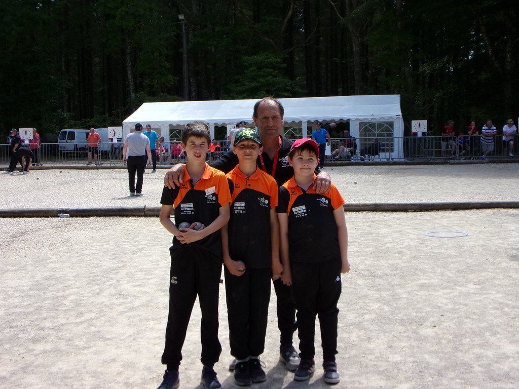 Timéo IMBERT / Rafaël GRENIER et Adrien KRANICZ avec leur beau maillot pour le CHAMPIONNAT DE FRANCE !!! Et la présence de leur éducateur et Président du Club, Bernard DUPUY
