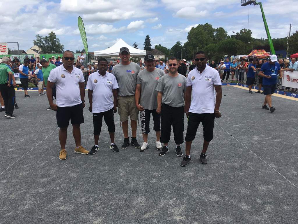 15h : de retour sur le terrain et dans les carrés d'honneurs, en effet une équipe nationale en face. Mais pas les Turcs, LES MALGACHES (Thierry BEZANDRY, Jacob RAJOELISON et Allain Samson MANDIMBY !!! Manu, un sacré blagueur...Encore une très belle partie à faire ! Pour ne pas changer, un début difficile en encaissant une mène de 5 points. Mène sur laquelle Manu, sur son 1er tir a fait réagir Philippe QUINTAIS qui jouait juste à côté et qui a confié à Jérôme AUTHIER : "En Norvège on appelle ça un saumon..." sur un ton humoristique bien entendu. Menés 0 à 6, nos 3 joueurs reviennent dans leur partie, Jérôme enchainant à l'appoint bouchon sur bouchon et faisant ainsi craquer Thierry BEZANDRY alors tireur de tête si bien qu'il est obligé de tourner avec MANDIMBY ! Manu de son côté assurant frappes (et carreaux ) et avec Dominique qui confirmait son rôle de milieu.