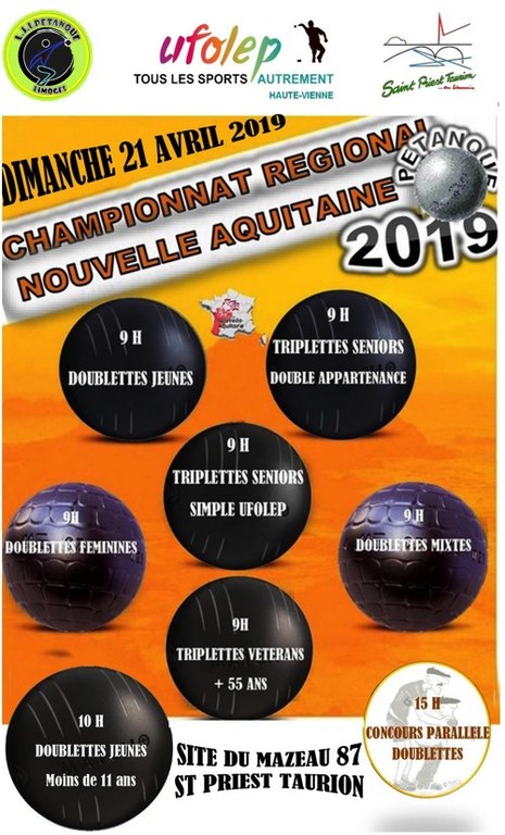 DIMANCHE 21 AVRIL 2019 AURA LIEU LE CHAMPIONNAT REGIONAL NOUVELLE AQUITAINE UFOLEP 2019. Organisé par LJL PETANQUE sur les terrains de ST PRIEST TAURION sur le Site du Mazeau. Règlement et modalités de la compétition dans la plaquette ci-jointe.