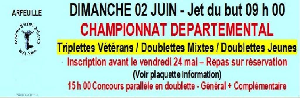 DIMANCHE 2 JUIN AURA LIEU LE CHAMPIONNAT UFOLEP DEPARTEMENTAL catégories VETERANS (Triplettes) / MIXTES (doublettes) / JEUNE (doublettes) sur les terrains d'ARFEUILLE. TIRAGE A VENIR LE 28 mai