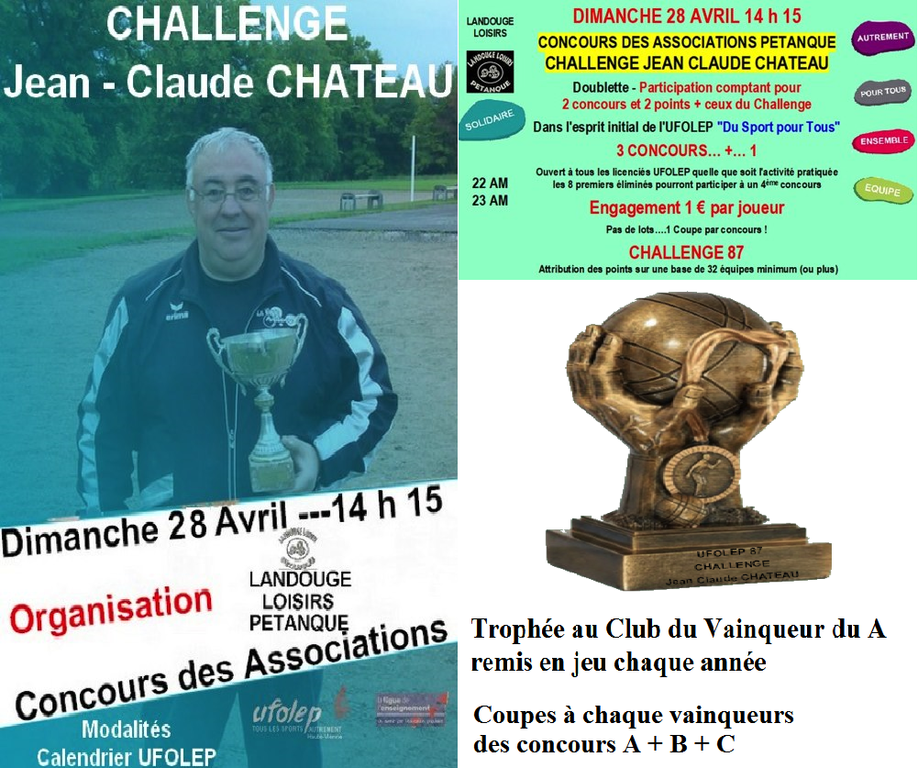 DIMANCHE 28 AVRIL AURA LIEU LE CONCOURS DES ASSOCIATIONS UFOLEP A LANDOUGE. A CETTE OCCASION ET EN MEMOIRE DE NOTRE CHER ET REGRETTE JEAN-CLAUDE CHATEAU, L'UFOLEP PETANQUE 87 A DECIDE QUE CETTE JOURNEE SOIT ASSOCIEE A LA MEMOIRE DE JEAN-CLAUDE. C'EST POUR CELA QU'UN CHALLENGE "JEAN-CLAUDE CHATEAU" A ETE MIS EN PLACE. CE CHALLENGE SERA REMIS AU CLUB DE L'EQUIPE VAINQUEUR ET REMIS EN JEU CHAQUE ANNEE. LE PRESIDENT DE LA BOULE AREDIENNE, BERNARD DUPUY, SOUHAITERAIT QU'UN MAXIMUM DE JOUEURS DU CLUB SOIENT PRESENTS POUR HONORER LA MEMOIRE DE YAYO EN PARTICIPANT A CE CHALLENGE. ADELE, L'EPOUSE DE JEAN-CLAUDE, DEVRAIT NORMALEMENT ETRE EGALEMENT PRESENTE.